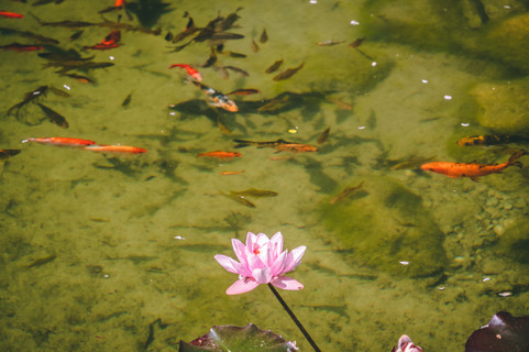 Störe, Bitterlinge und Karpfen in unserem Teich.